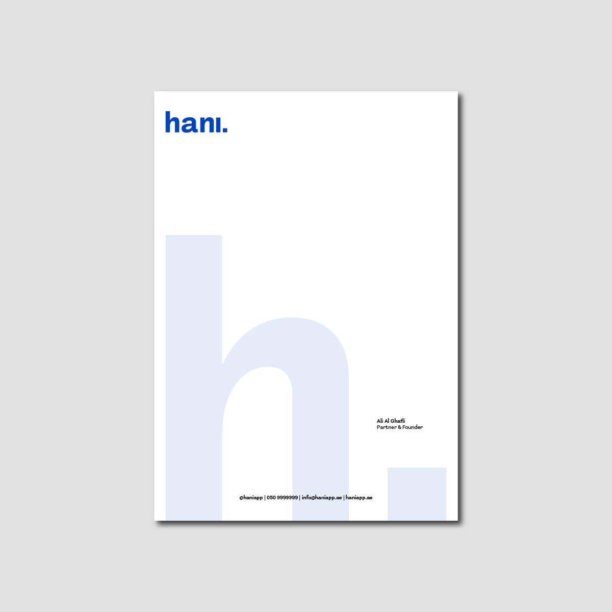 The Hani app’s logo design draws inspiration from the seamless blend of modern minimalism and the enduring charm of the color blue. In Hani’s branding, we have utilized a sleek sans-serif font that conveys a sense of modernity and clarity. The incorporation of the blue color in our application’s branding symbolizes qualities such as trust, stability, and a solid foundation. The originality of the brand is in the typographic construction.