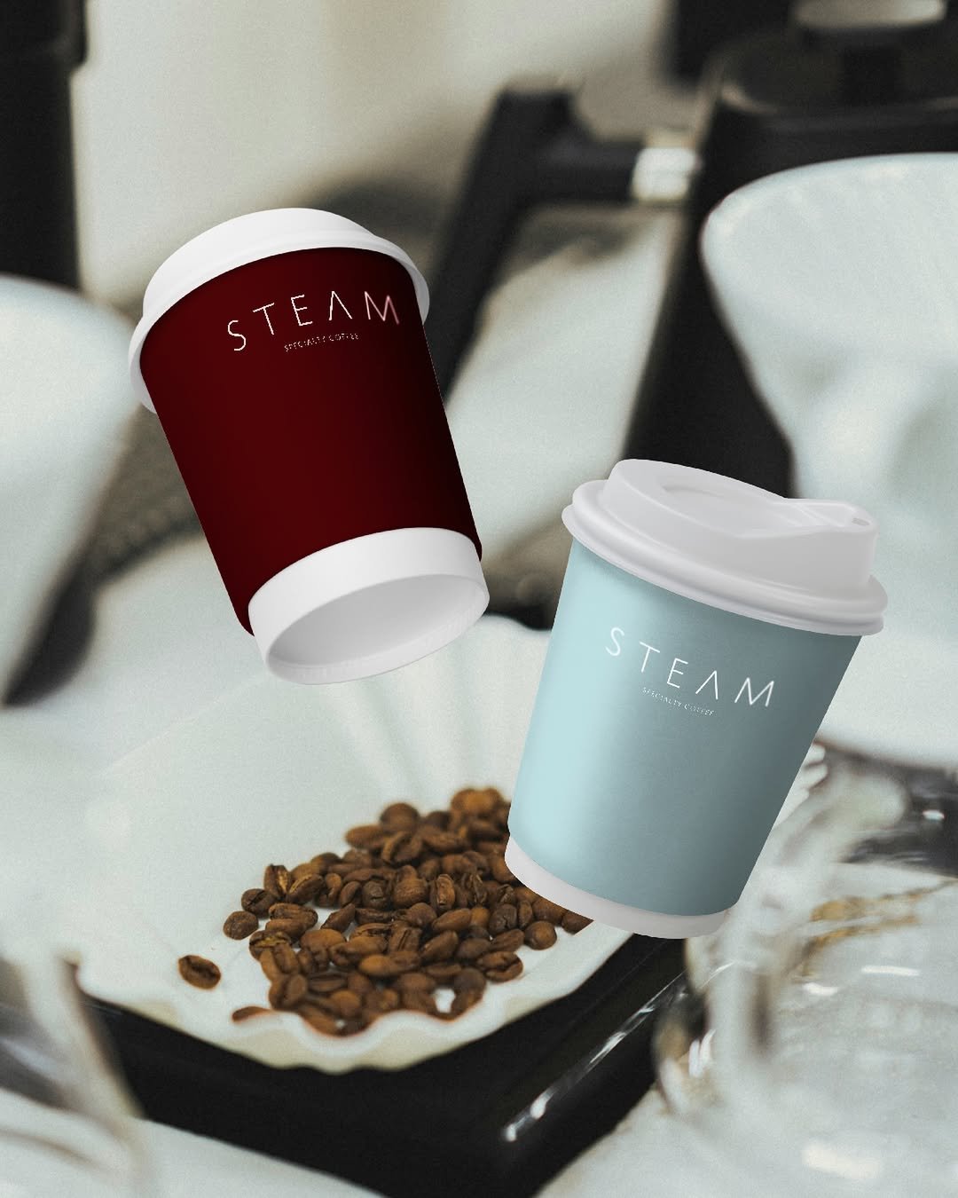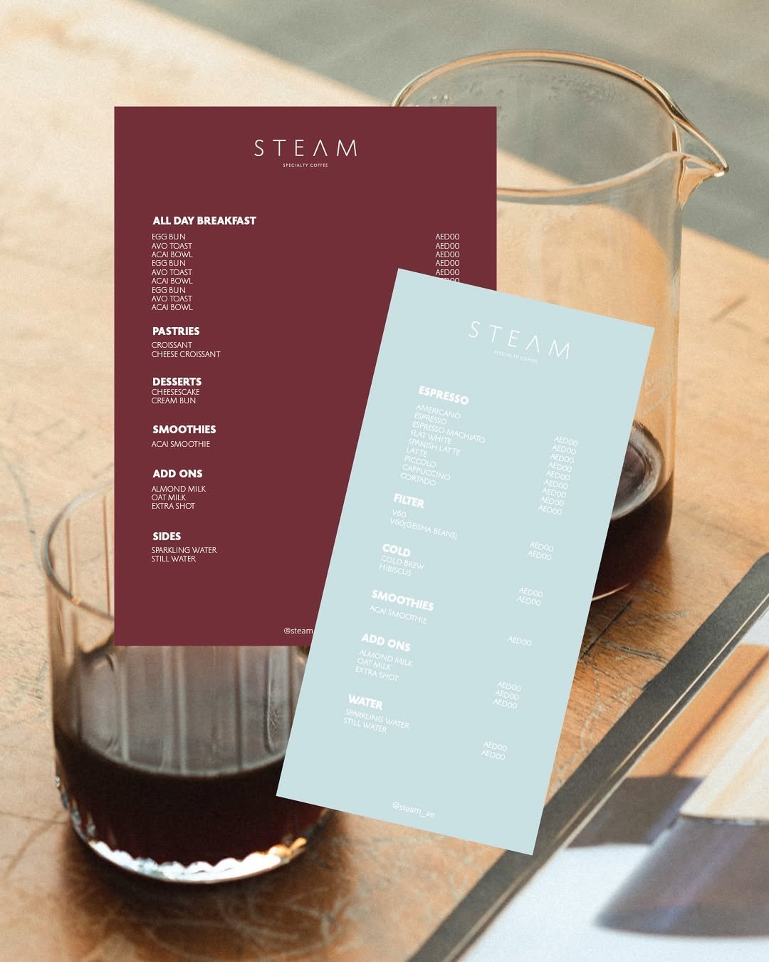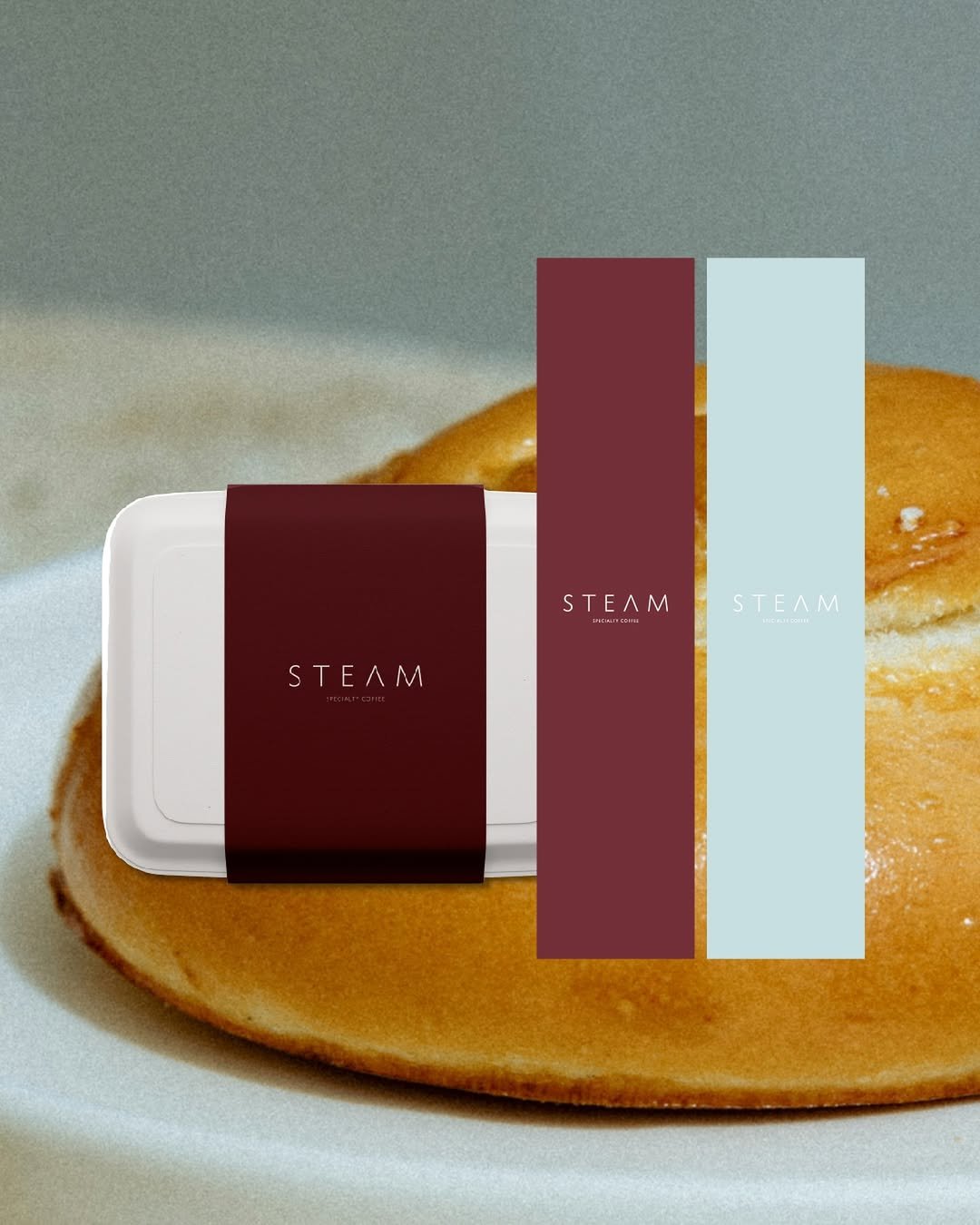 The visual identity of Steam Cafe is a perfect blend of warmth and sophistication. The rich maroon, baby blue, and hint of brown create a timeless aesthetic that complements their delicious coffee.